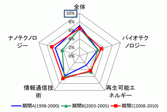 2)情報通信、バイオテクノロジーの技術分類には国際特許分類を使用。ナノテクノロジーの技術分類にはY01Nを使用。再生可能エネルギーの技術分類にはY02E1を使用。
