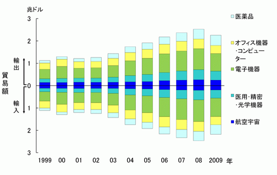 中国はハイテクノロジー産業貿易の金額が大きく伸びており、特に「電子機器」の増加が激しいが、出超となったのは2008年からである。1990年代から出超となっていたのは「医薬品」、「オフィス機器・コンピューター」である。