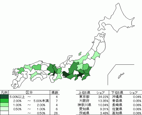 - 特許出願件数シェアの分布をみると、東京都のみで51.72%を占め、さらに上位4都道府県のみで80%以上を占める(図6-1)。これは、企業の本社所在地が東京都に集中しており、特許出願の際には本社の住所が記載されることが多いためと考えられる。
