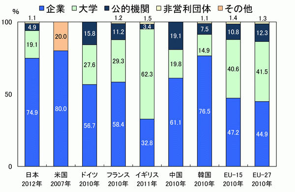 主要国の研究者の部門別割合については、日本、米国、韓国では企業部門の研究者の割合が7割を超えている。一方、イギリスでは大学部門の割合が最も大きく6割を超えている。