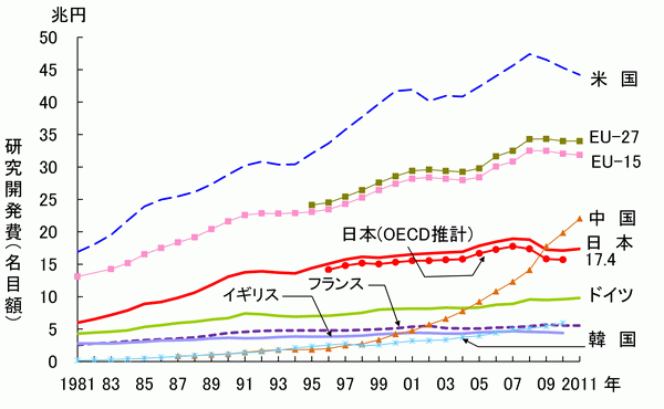- 日本の研究開発費総額は2011年度で17.4兆円である。前年と比較すると1.6%の増加であり、2008年度から3年続いた減少は止まった感がある。また対GDP比率は3.67%であり、2010年度と比較すると、0.1ポイント増加している。