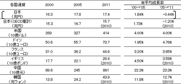 米国は2000年代後半から増加傾向にあったが近年、減少に転じている。ドイツは、2000年代後半からその値を大きく伸ばしている。フランス、EUは近年では横ばいに推移している。イギリスは1990年代後半から、その伸びは鈍化している。一方韓国の値は増加し続けており、2006年から3%を超え、2010年値は日本を追い越して、3.74%を示している。