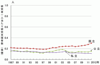 - 日本の大学部門の研究者一人当たりの研究支援者数は横ばいである。