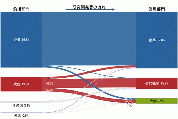 「政府」については、「公的機関」及び「大学」に流れている国が多い。「大学」に最も多く流れている国は、日本、ドイツ、フランス、英国である。「公的機関」に最も多く流れている国は、日本(OECD推計)、米国、中国、韓国である。「政府」から「企業」への流れは、ほとんどの国でそれほど大きくはないが、米国、英国、フランス、韓国では「政府」の約2割が企業に流れている。