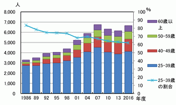 国、公立大学での60歳以上の比率は、元々低かったがそれでも増加している。一方、私立大学では、そもそも60歳以上の比率が国公立大学より高く、2010年では、いずれの年代の比率も同程度となっている。私立大学の2016年では25-39歳の比率が一番低い。
