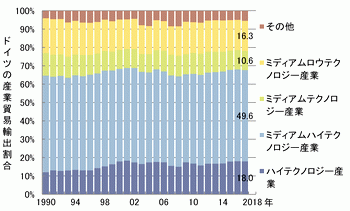ドイツはMHT産業が半数を占めており、2017年では49.6%である。次いでHT産業が18.0%、MLT産業が16.3%、MT産業が10.6%となっている。時系列を見ると、ドイツは他国と比較すると変化が少なく、MHT産業、MLT産業、MT産業は横ばい又は微減、HT産業は漸増している。