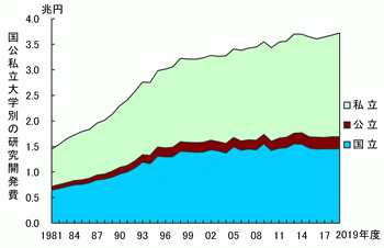 2019年度の日本の大学全体の研究開発費(3.7兆円)を国・公・私立大学別で見ると、国立1.5兆円、公立0.2兆円、私立2.0兆円であり、私立大学の研究開発費が全体の半数以上を占めている。