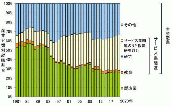 - 「理工」系博士課程学生の就職者の場合、「製造業」への就職割合は概ね30%前後で推移しており、2020年は32.5%である。「教育(学校へ就職した者など)」については1980年代半ばには50%に達したこともあったが、2000年代に入ると約3割まで減少し、2020年では27.5%である。また、「研究(学術・研究開発機関等へ就職した者など)」は、2020年では13.8%である。非製造業(研究、教育を除く)は、近年増加傾向にあり、2020年は26.2%となっている。