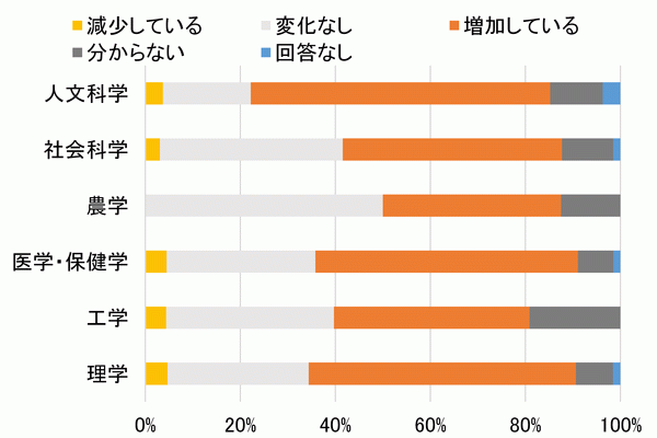 日本の状況をみると、回答を得た研究組織では、多数(工学、医学、人文科学で約5割、理学、社会科学で約7割、農学で約8割)が10年以上前にコミュニケーション活動を開始している。工学、農学では約4割、社会科学では約5割、理学、人文科学では約6割が5年前よりも活動を増やしている(図表5-5-6参照)。