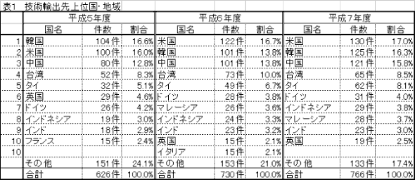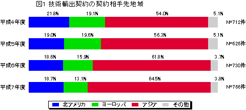 | 我が国の技術貿易は、輸出はアジアとの、輸入は欧米との取引がそれぞれ中心となっている。アジアの一部の国・地域では、欧米と比べて技術に対する意識が低く、技術輸出側の権利よりも技術輸入国の利益が優先されることが多くなっている。そのために、技術輸出は技術輸入と比較して、契約期間やランニングロイヤルティの料率などの契約条件に違いが見られる。今日輸出している技術は将来の技術の原資となるものであり、その権利の保護が重要であると思われる。 |