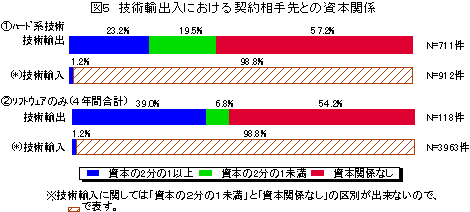 | ・ | 技術輸出においては資本関係のある(資本の2分の1以上、2分の1未満の両方を含む)企業への輸出の割合が、ハード系技術で42.8%、ソフトウェアで45.8%と高くなっている。 | ||