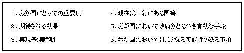 | 社会経済発展への寄与 | : | 革新的製品の開発、新産業の創出、経済フロンティアの拡大、社会経済基盤の整備等 | |