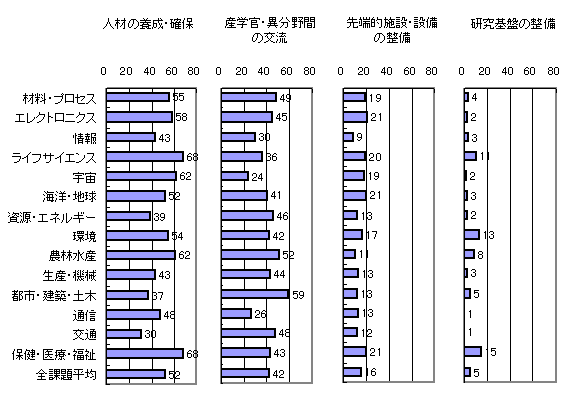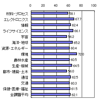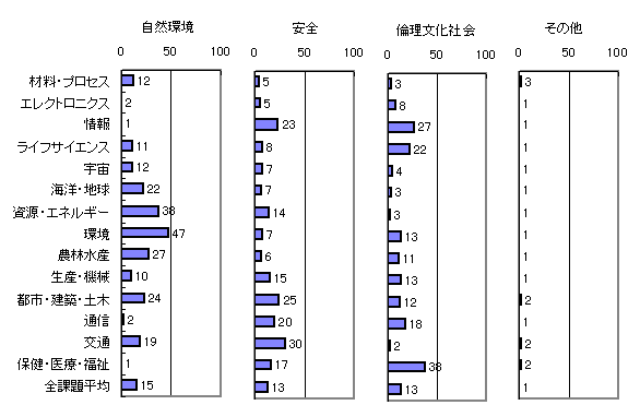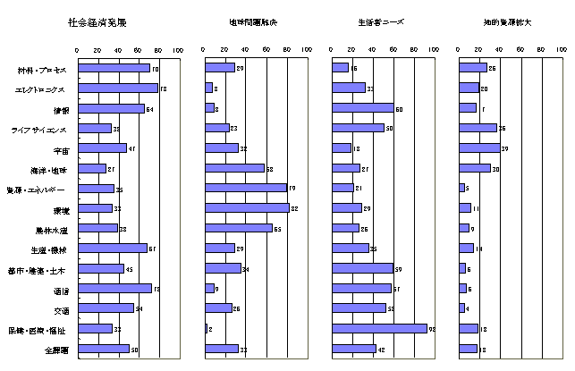 | 各課題についてのパーセントを分野毎に平均すると図2のとおりである。社会経済発展への寄与が高いと考えられているのはエレクトロニクス、通信、材料・プロセス、生産・機械、情報などの分野であり、地球規模の諸問題の解決に向けては環境、資源・エネルギー、農林水産などの分野が重視されている。一方生活者ニーズへの対応としては、保健・医療・福祉、情報、都市・建築・土木等の分野に重視された課題が多い。 | |||