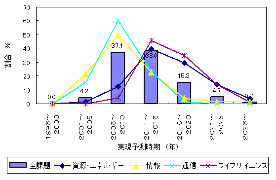 | ・ | 2006年〜2010年及び2011年〜2015年の5年間に実現すると予測された課題は、それぞれ全体の1/3強を占めており、この10年の間に実現すると予測された課題数は全体の3/4にのぼる。 |