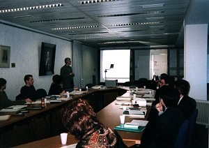 22日は、朝9時から12時半過ぎまで、筆者からペーパー"The Structure and Perspective of Science and Technology Policy in Japan" およびOHPにより日本の科学技術政策の枠組み、政策形成システム、諮問機関、技術予測と優先度付け、研究評価などについて説明するとともに、行政改革の動きについても説明をした。グループ・メンバーがとくに関心をもって質問してきた事項は、行政改革、技術予測および研究評価であったが、他の事項についても質問があり、3時間半が短く感じられた程であった。