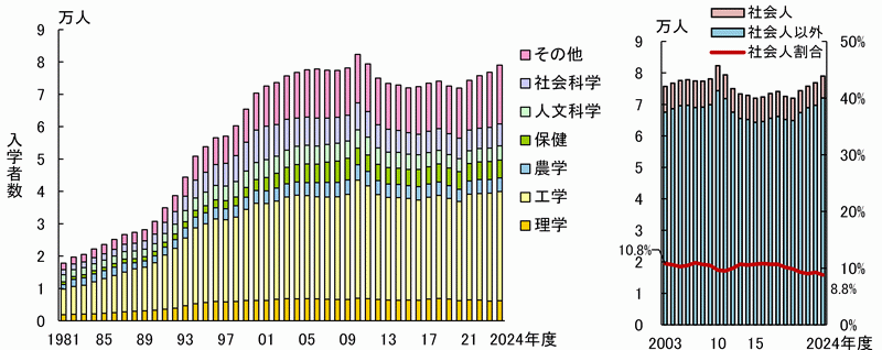日本の大学院修士課程の入学者数は2010年度をピークに減少傾向にあったが、2020年度を境に増加している。2024年度では対前年度比2.8%増の7.9万人、そのうち社会人の割合は8.8%である。