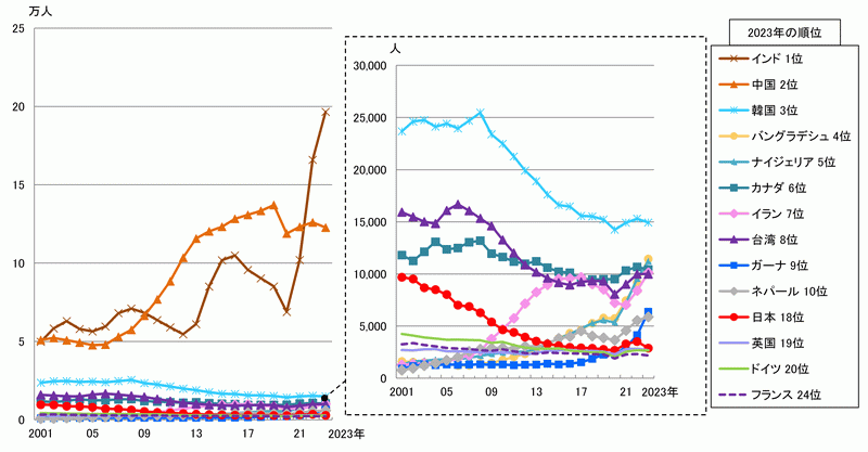 米国における外国人大学院生を見ると、インドと中国が拮抗しつつその数を伸ばしている。2020年には両国とも減少したが、その後のインドは大きく増加し2023年では19.7万人となった。中国の伸びは小さく、同年で12.3万人となった。