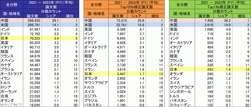 論文の生産への貢献度を見る分数カウント法では、日本の論文数(2021-2023年の平均)は、中、米、印、独に次ぐ第5位である。注目度の高い論文を見るとTop10%補正論文数では第13位、Top1%補正論文数では第12位である。中国は論文数、Top10%・Top1%補正論文数において世界第1位である。
