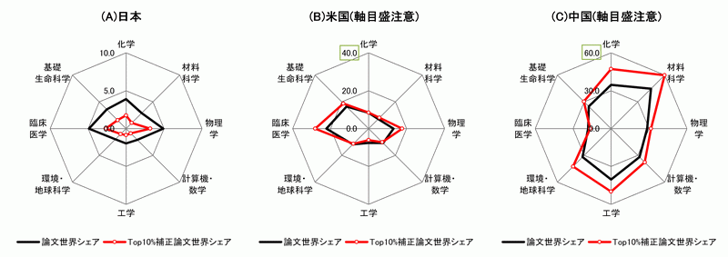 Top10%補正論文数シェアの分野バランスを見ると、日本は「物理学」、「臨床医学」のシェアが他分野と比べて高い。米国は「臨床医学」、「基礎生命科学」、「物理学」のシェアが高い。中国は「材料科学」、「工学」、「化学」のシェアが高い。