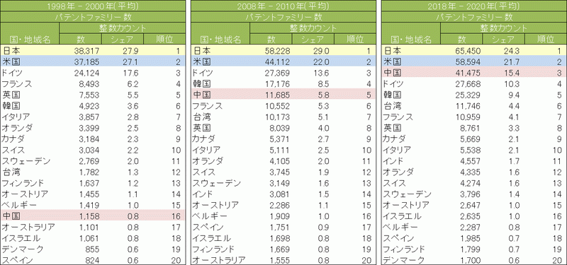 特許出願に着目し、各国・地域から生み出される発明の数を国際比較可能な形で計測したパテントファミリー数を見ると、1998-2000年、2008-2010年、2018-2020年の3時点で日本が世界第1位、米国が第2位となっている。ただし、日本の世界シェアは2000年代半ばから低下傾向にある。中国は2018-2020年で世界第3位であり、急激にその数及びシェアを増やしている。