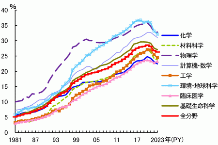 各分野の2023年時点の国際共著論文割合を見ると、物理学では32.8%、環境・地球科学は32.1%であり、他分野に比べ割合が高い。化学は22.4%であり、国際共著論文割合が一番低い。2020年頃から、全ての分野で国際共著論文割合は低下している。