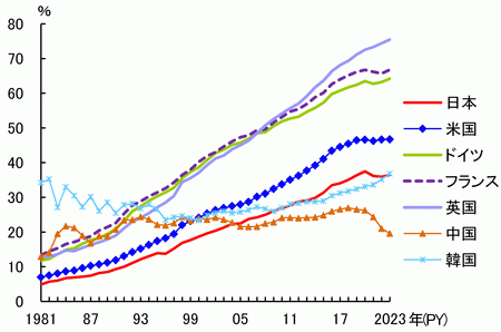 主要国の状況を見ると、英国や韓国は上昇、日本、米国、ドイツ、フランスは2020年頃から横ばい傾向である。中国は2018年を境に低下が続き、2018年と2023年を比較すると7.4ポイント低下した。