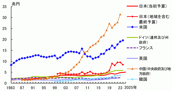 米国については、2009年にARRA(American Recovery and Reinvestment Act of 2009)による特別な予算が措置された以降は減少が続いていた。その後、2013年を境に増加傾向であり、2024年では19.5兆円となった。