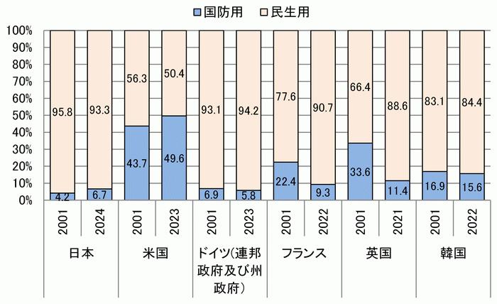 科学技術予算を国防関係の経費(国防用)(日本の場合は防衛省の科学技術関係予算)とそれ以外の経費(民生用)に分類して見る(図表1-2-1(B))。各国最新年では、日本(当初予算)は93.3%が民生用科学技術予算で占めている。米国については、国防用科学技術予算の割合が他国と比較すると大きく49.6%である。韓国では、国防用科学技術予算の割合は民生用と比較して少ないが、最新年で見ると日本やドイツと比較すると大きい割合である。また、米国と日本以外の国では、2001年に比べて国防用の割合が低下しており、特にフランス、英国の減少が著しい。日本(当初予算)については、2020年代に入ってから国防用科学技術予算の割合が上昇している。