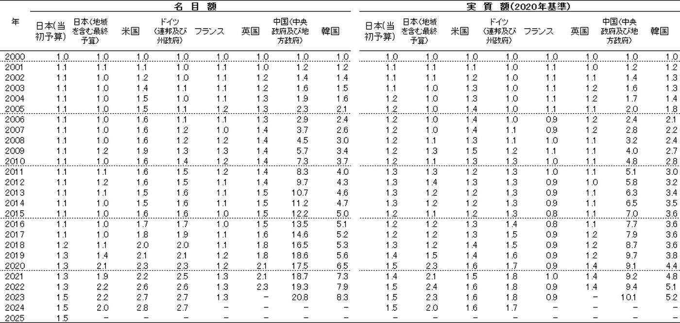 実質額を見ると、日本以外の国は名目額より低い数値となっている。最新年を見ると、日本は地域を含む最終予算の場合2.0(当初予算は1.5)である。ドイツは1.7、米国は1.6、英国は1.4である。中国は10.1、韓国は5.2と順調な伸びを見せている。主要国の中では、フランスが0.9と最も伸びが小さい。