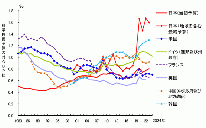 4) 日本は年度である。日本(当初予算)とは国の科学技術関係予算である。日本(地域を含む最終予算)とは、①国の当初予算、②国の補正予算等、③都道府県と政令指定都市の最終予算の合計値である。なお、2021年以降の③については、当初予算を使用している。