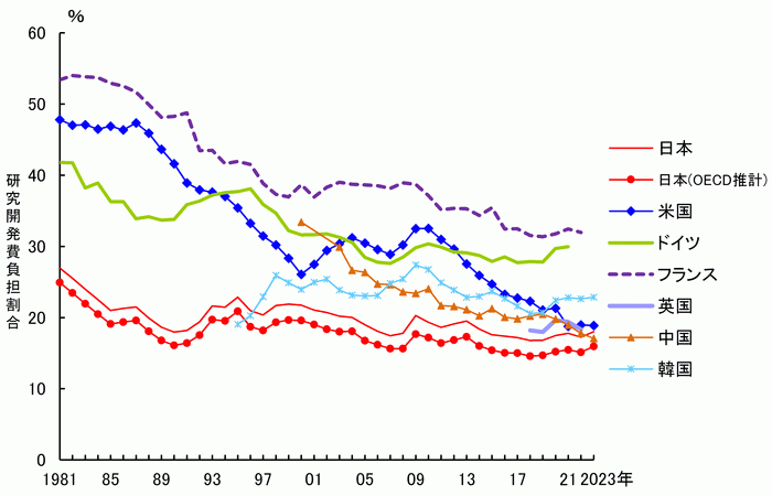 主要国における政府の研究開発費負担割合を見ると(図表1-2-4)、最新年において最も大きい国はフランスであり32.0%である。これにドイツが30.0%、韓国が22.9%、米国が18.9%と続く。フランス、米国は2000年頃まで長期的に減少傾向にあり、2010年頃までフランスは横ばい、米国は増加傾向にあった。その後、フランスは緩やかに、米国は大きく減少している。中国についても長期的に減少傾向にあり、最新値は17.1%である。