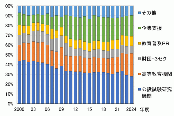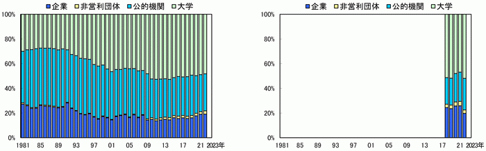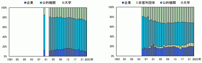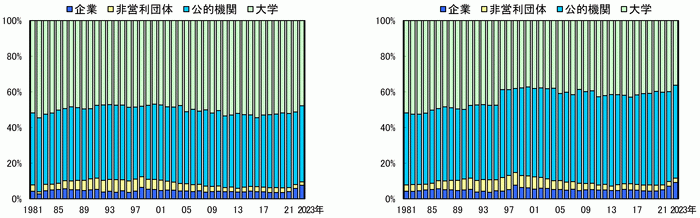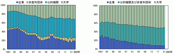 日本は、「大学」部門と「公的機関」部門が大きな割合を占めており、「大学」部門への支出は約半数である。他国と比較して「企業」部門への支出割合が少ない点が日本の特徴であるが、近年は増加している。2023年は2020年と比較して約2倍の7.5%である。「大学」部門への支出割合は2000年頃から微増した後、2010年代に入ってほぼ横ばいに推移していたが、最新年では約4ポイント減少している。