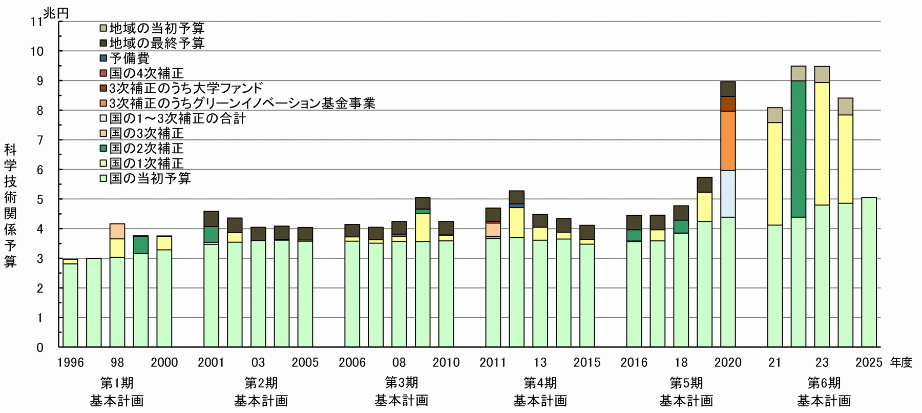 第5期基本計画(2016~2020年度)の5年間の推移を見ると、当初予算は継続して増加しており、補正予算等も多く組まれた。2020年度補正予算には、第3次補正で措置された「グリーンイノベーション基金事業(2兆円)」及び「10兆円規模の大学ファンド(0.5兆円)」を含んでいる。5年間の当初予算額の合計は19.6兆円、補正予算等を含めると23.4兆円(先で述べた2.5兆円を含めて25.9兆円)、地域の最終予算も含めると25.9兆円(先で述べた2.5兆円を含めて28.4兆円)であった。