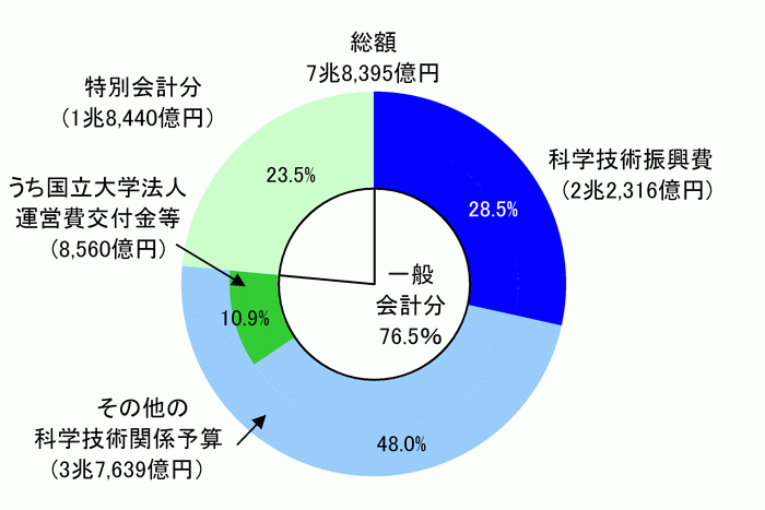 日本については、「科学技術関係予算」を科学技術予算としている。日本の科学技術関係予算は、①科学技術振興費(一般会計予算のうち主として歳出の目的が科学技術の振興にある経費)、②一般会計中のその他の研究関係費、③特別会計中の科学技術関係費の合計から成る。