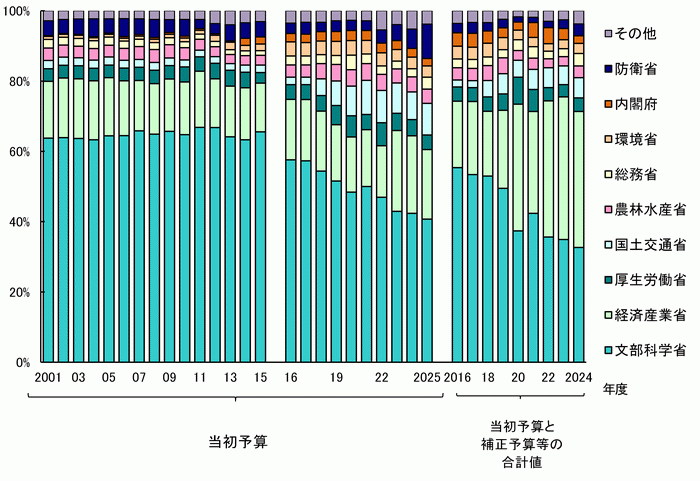 - 科学技術関係予算(当初予算と補正予算の合計値)を府省別の割合で見ると、2024年度では経済産業省が38.7%、文部科学省が32.7%であり、この両省で全体の約7割を占める。2016年度と比較すると、文部科学省は23ポイント減少し、経済産業省は20ポイント増加した。経済産業省の規模の拡大は主に補正予算の増加による。科学技術関係予算における府省のバランスは2016年度以降変化している。