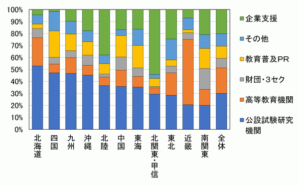 次に、性格別の科学技術関係予算を地域区分で分類した(図表1-2-11)。「公設試験研究機関」の割合が最も大きいのは北海道、これに四国、九州、沖縄が続いており、いずれも約半数を占めている。「企業支援」の割合が最も大きいのは北関東・甲信であり、全体の半数を占める。これに次いで、北陸が全体の約4割を占める。「高等教育機関」の割合が最も大きいのは近畿であり、約5割を占めている。このように地域区分により、地域の科学技術関係予算の内容に差異が見られる。
