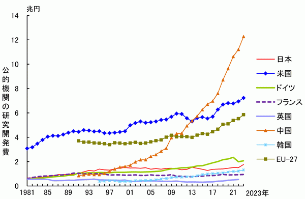 - 日本の公的機関部門の研究開発費は、2023年で1.8兆円である。中国は1990年代中頃から急速に増加し始め、2013年に米国を上回り、2023年では12.3兆円と主要国の中で1番の規模となっている。米国の2023年の値は7.2兆円である。ドイツは2000年代中頃から増加傾向にあり、2010年以降日本を上回り、2023年では2.1兆円である。