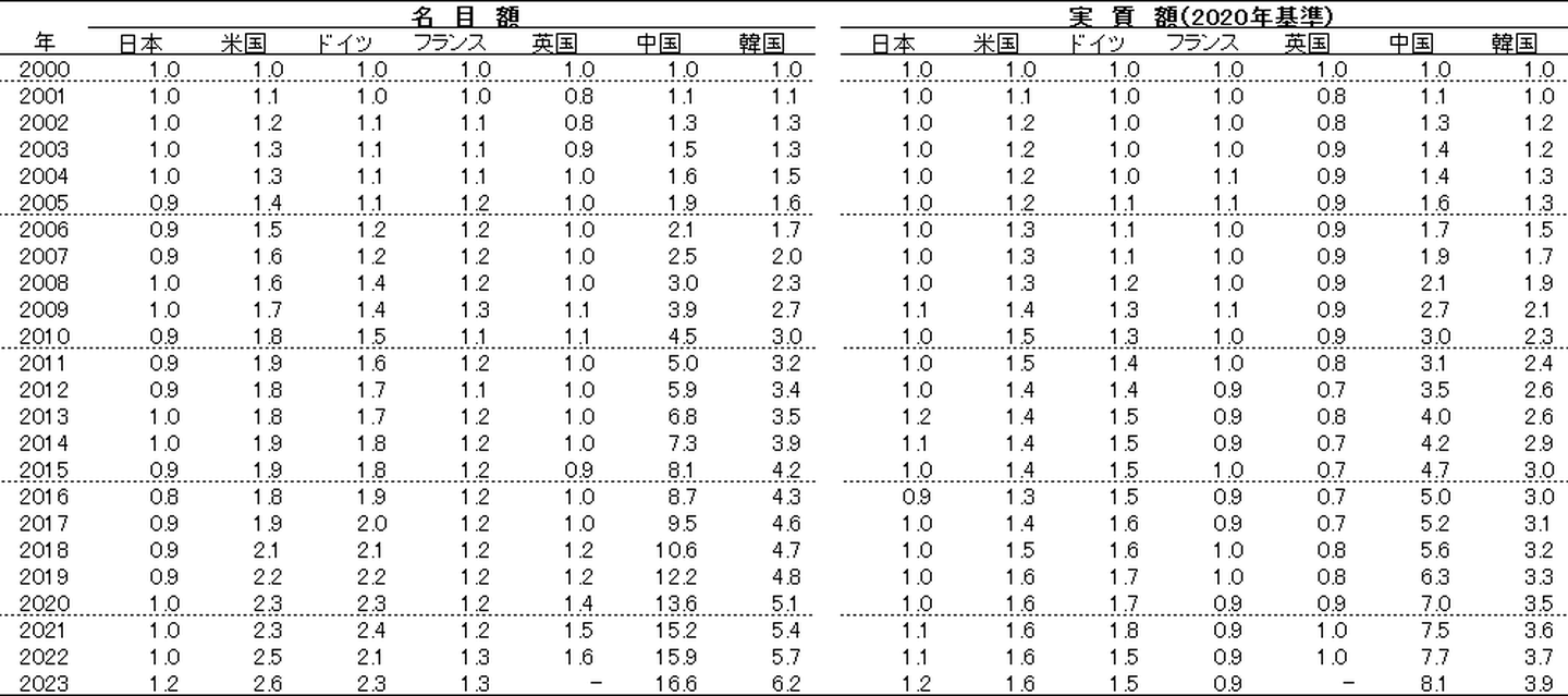 実質額での伸びを見ると、日本以外の国では名目額より実質額の方が低い。日本は1.2、米国が1.6、ドイツが1.5、英国は1.0である。実質額でも中国は8.1、韓国は3.9と大きく伸びている。フランスはマイナス成長であり0.9である。