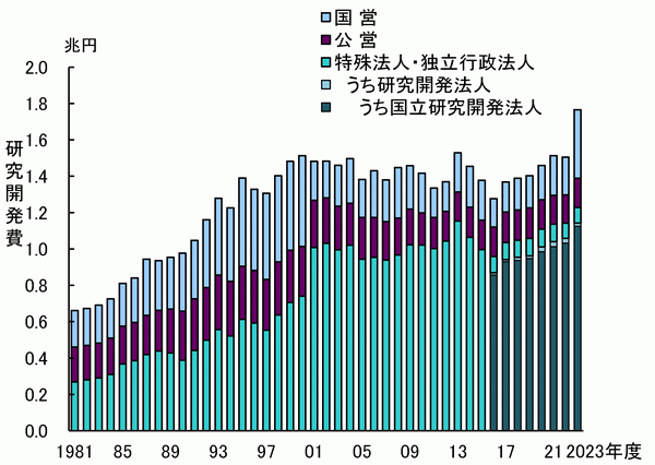国営研究機関と特殊法人の独立行政法人化により、2001年度以降は、「国営」と「特殊法人・独立行政法人」のデータの連続性が失われている。また、2011年度から「特殊法人・独立行政法人」には営利を伴う機関も含まれている。