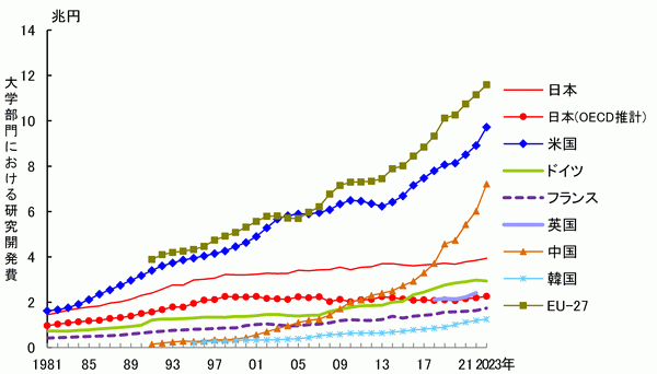 以下においては、日本の大学部門の研究開発費として、OECDが発表している値(「日本(OECD推計)」と明記)と総務省「科学技術研究調査報告」が発表している値(「日本」と明記)を掲載することとする。