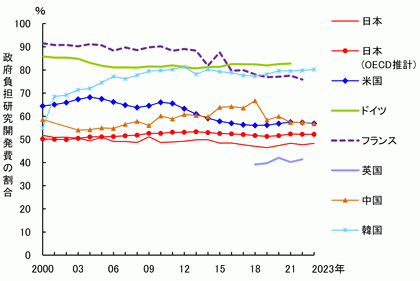 なお、英国は「企業」と「大学」の研究開発費使用額が上方に改訂され(1.1.1項参照)、それに伴い、負担額についても変更されている。このため、英国の値は科学技術指標2022以前の数値とは異なることに留意されたい。具体的には政府の負担割合が減少する一方で、企業の負担割合が増加している。