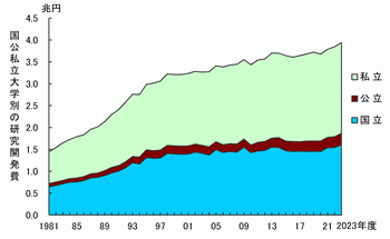 2023年度の日本の大学全体の研究開発費(3.9兆円)を国公私立大学別で見ると、国立1.6兆円、公立0.3兆円、私立2.1兆円であり、私立大学の研究開発費が全体の約半数を占めている。