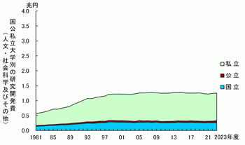 人文・社会科学及びその他分野における研究開発費は、2023年度において全体で1.3兆円である。うち国立0.3兆円、公立0.1兆円、私立0.9兆円となり、私立大学が約7割を占める。その推移を見ると、国立、公立大学ともに、1990年代中頃まで続いた研究開発費の伸びは鈍化し、その後はほぼ横ばいに推移している。私立大学は2000年代中頃以降、ほぼ横ばいに推移している。