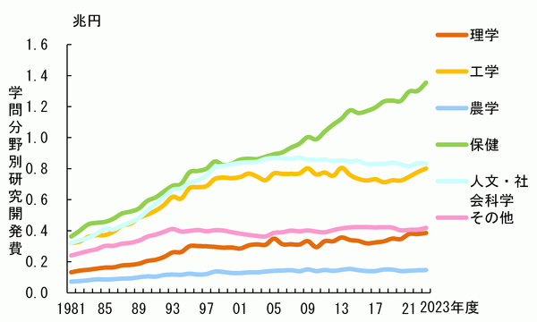 図表1-3-16を見ると、1990年代後半までは、ほとんどの分野で研究開発費は増加傾向にあった。大きく増加したのは、保健、人文・社会科学、工学である。2000年代に入っても、増加し続けているのは保健であり、2023年度では1.4兆円である。他の分野は、横ばい又は微増で推移している。工学については2020年代に入ってから3~4%増が続いている。