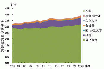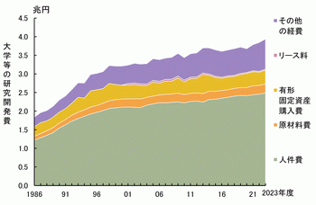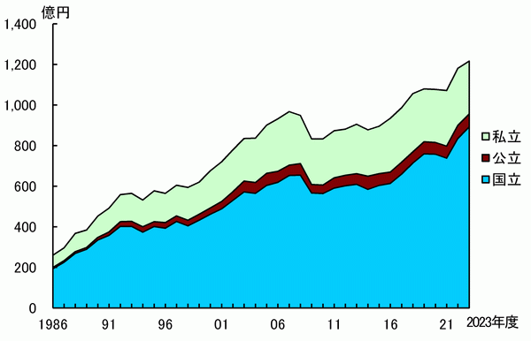 自然科学分野における研究開発費は2023年度において全体で2.7兆円、うち国立1.3兆円、公立0.2兆円、私立1.1兆円となり、国立大学が半数を占める。国公私立大学ともに、1990年代中頃まで研究開発費の伸びは続いた。その後、国立大学の伸びは鈍化し、約1.2兆円で推移していたが、近年増加している。私立大学については増加傾向が続いている。また、公立大学は2010年代に入って増加傾向にある。