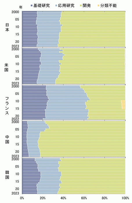 2023年(26)の日本の性格別研究開発費のうち「基礎研究」の割合は全体の14.4%、「応用研究」は20.5%、「開発」が65.2%である。他国と比べて割合の変化は小さいが、2010年頃から、「応用研究」が減少し、「開発」が増加傾向にある。