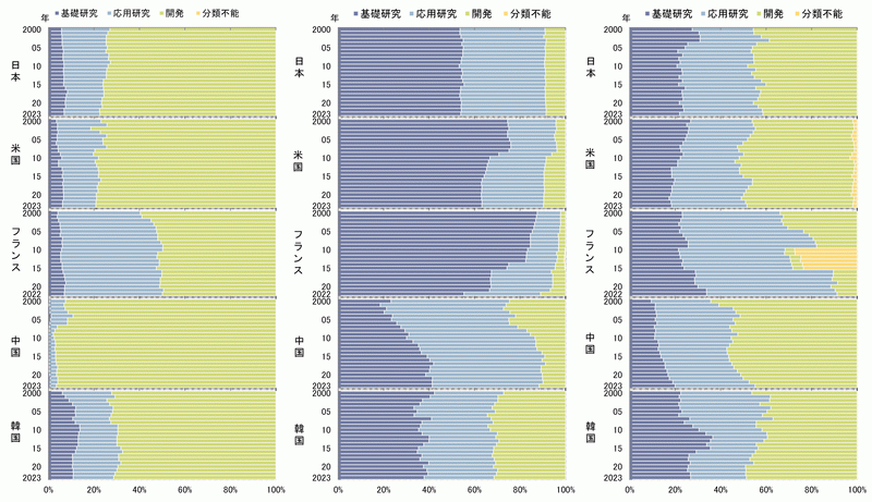 - 「企業」の性格別研究開発費は、いずれの国でも「開発」が最も大きく、「基礎研究」が小さい傾向にある。「大学」の性格別研究開発費は、ほとんどの国で「基礎研究」が最も大きい傾向にあるが、中国では「応用研究」が最も大きい。最新年の「基礎研究」の割合は、米国、フランスが約6割、日本が約5割、中国、韓国が約4割となっている。