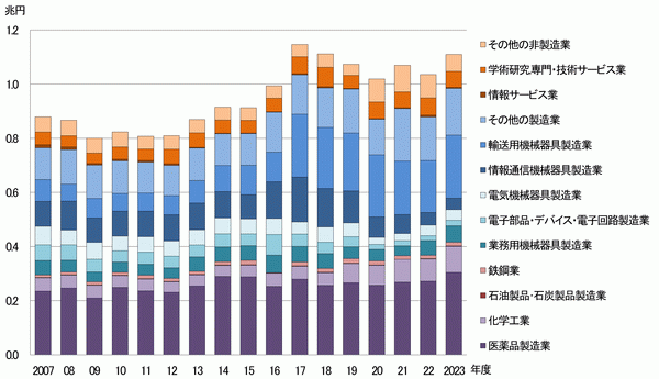 2007年度と比較すると、医薬品製造業は1.3倍、輸送用機械器具製造業は2.9倍、化学工業は1.9倍、学術研究,専門・技術サービス業は1.3倍となっており、輸送用機械器具製造業の伸びが著しい。他方で、電子部品・デバイス・電子回路製造業は0.4倍、情報通信機械器具製造業は0.5倍、電気機械器具製造業は0.6倍となっており、2007年度から減少している。