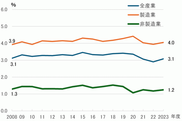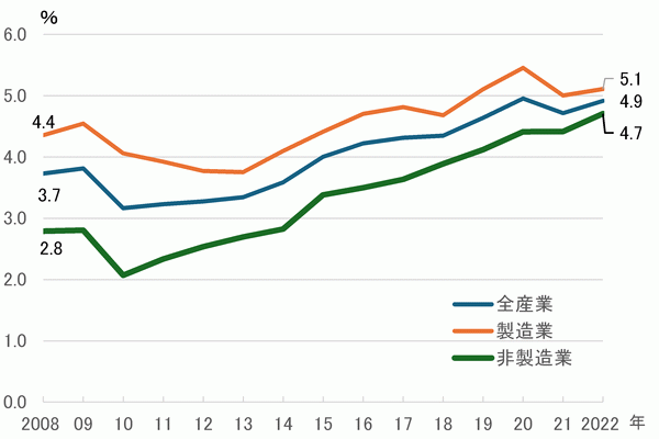米国では、製造業については2009年から2013年まで0.8ポイント減少した後に増加に転じた。その後は2020年度から2021年度にかけて0.5ポイントの減少した以外は大きな減少は見られなかった。非製造業については2009年から2010年にかけて0.7ポイント減少した後は継続して増加している。2008年と比較すると、非製造業は1.9ポイント、製造業は0.8ポイント増加した。2022年では製造業5.1%、非製造業4.7%となり、非製造業と製造業の差が小さくなっている。