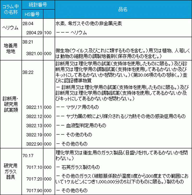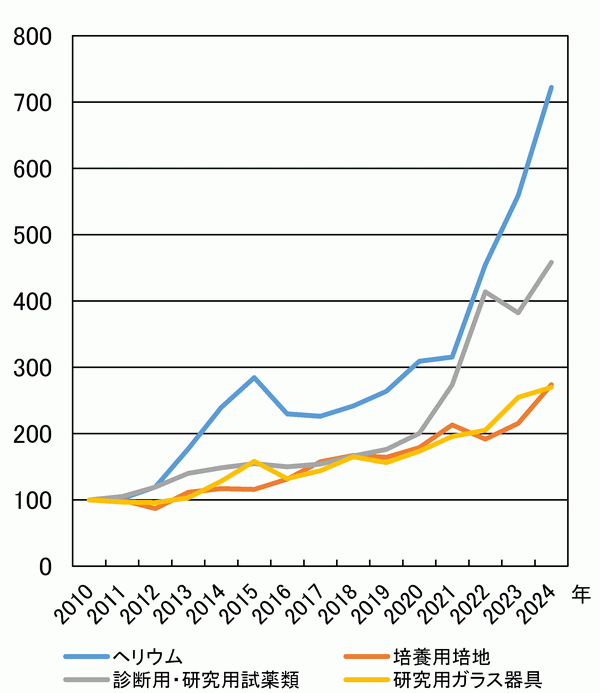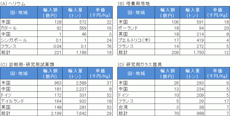 研究用消耗品には、多様な品物が含まれるが、ここではコラム図表2-1に示す統計品目に注目した。ヘリウムは、超伝導体の冷却や低温物理実験に不可欠な希ガスであり、物理学に加えて、磁気共鳴画像装置などでも用いられる。培養用培地や診断用・研究用試薬品については主に生命科学、医学、化学で用いられる研究用消耗品である。研究用ガラス器具は、実験室で用いるビーカー、フラスコ、メスシリンダー等のガラス製器具である。